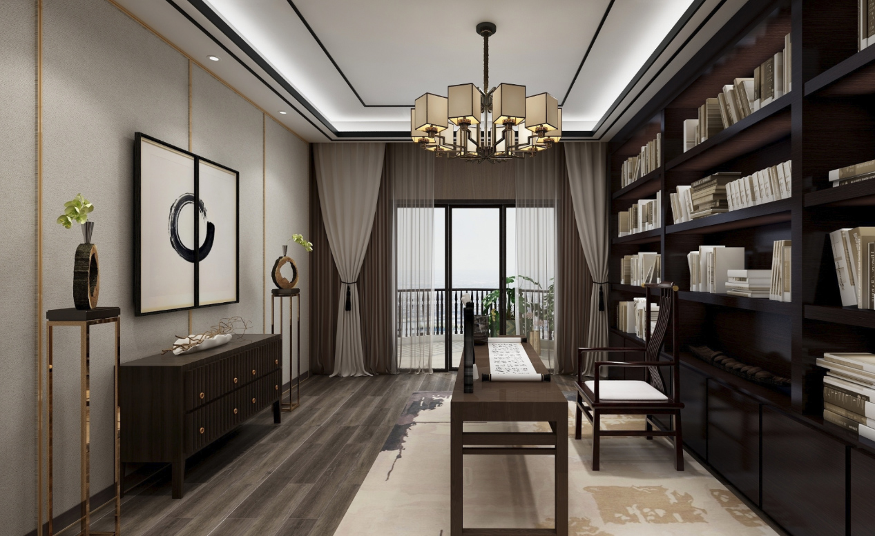 該房子的客廳面積非常大,吊頂造型上,男主人要求造型夸張一些,不要傳統(tǒng)的邊吊,影視墻造型采用傳統(tǒng)的三段式,規(guī)整又不失典雅,中心視角運用中國的水墨元素搭配方形壁燈,更能凸顯新中式的氣質(zhì)。主臥墻面采用素色墻布,增加墻面的肌理感,吊頂線條以中式深咖色實木線條為主,飄窗設(shè)計為休閑飄窗,空閑下來可以喝喝茶、看看書,面積雖小,不失生活的品味。同風(fēng)格案例:更多>>